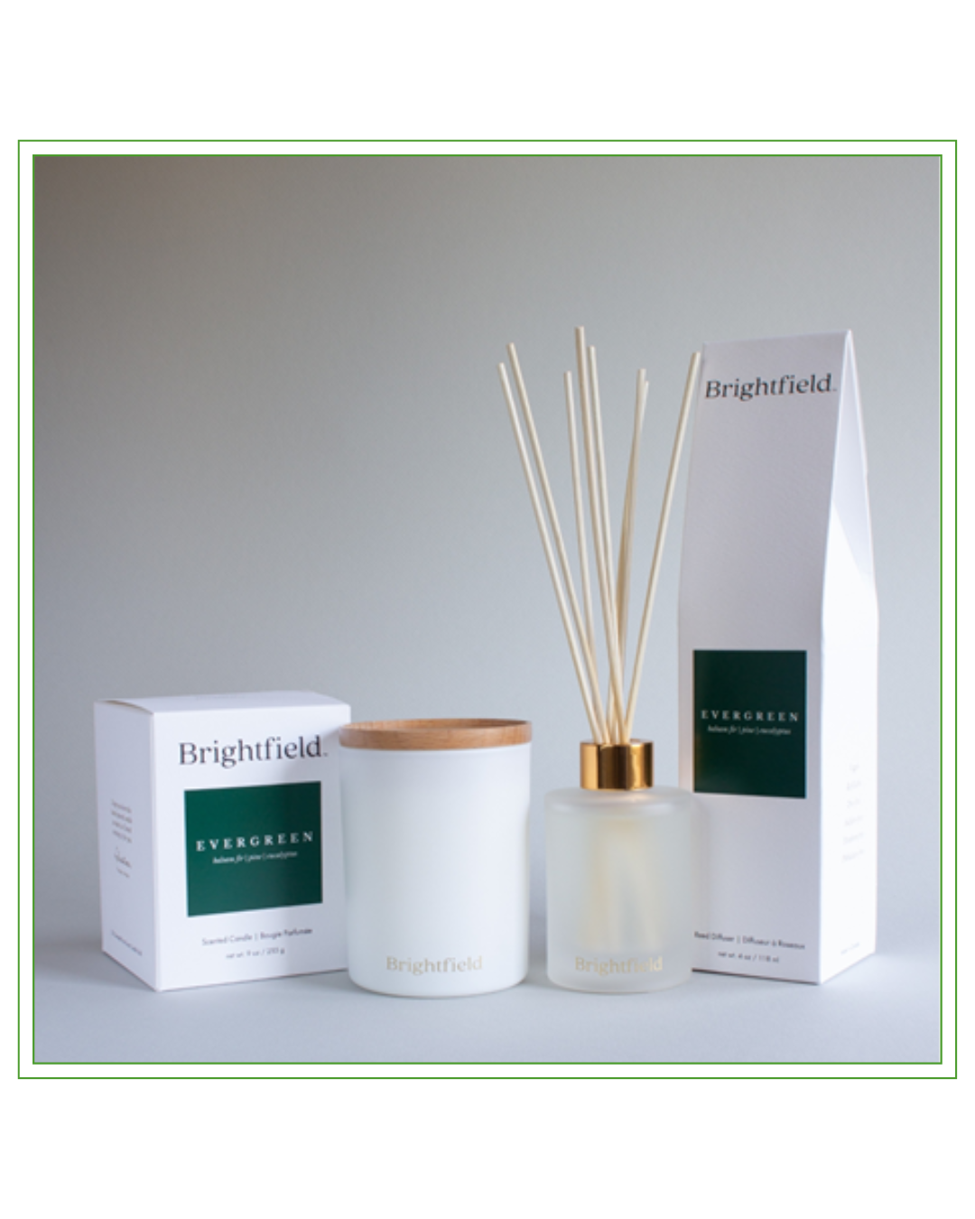 Brightfield's Evergreen Candle and Diffuser Set captures the nostalgic and uplifting scent of a real Christmas tree. With notes of balsam fir, pine, and eucalyptus, it smells like Christmas morning and will help spark joy this holiday season.