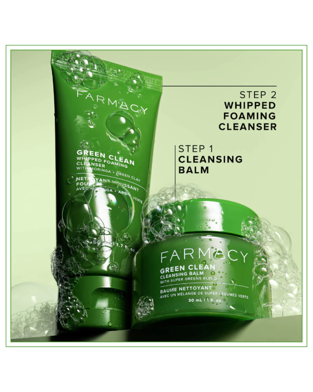 Deep Double Cleanse Duo: Farmacy’s best-selling Green Clean Cleansing Balm (30ml) and pH-balanced Green Clean Whipped Foaming Cleanser (50ml). A 2-step double cleansing kit that works in harmony to meltaway makeup, spf and excess oil while purifying pores for soft & balanced skin.
